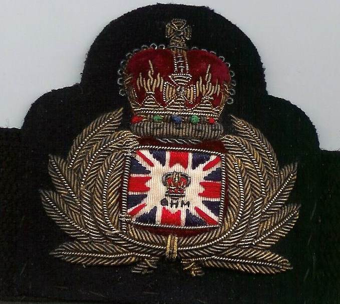 NSN 8455-99-415-5777 'Description; Badge , Organisational, Cap. Port Auxilliary Master, Embroidered, Embroidered , Harbour Master Flag, gold ,red, laurel wreath, Crown' 'Additional information: Qualified Navy Department Pilot.'