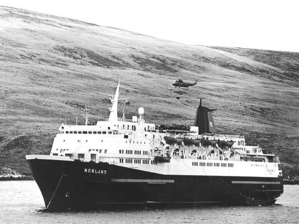 Capt D A Ellerby (CBE) and NP 1850, Cmdr C J Esplin-Jones (OBE) RN. Req 17 April. Sailed 26 April with 2 Para. San Carlos 21 May. Brought part 5 Bde from S. Georgia. Took POWs to Montevideo & Puerto Madryn. Sailed N 23 June.